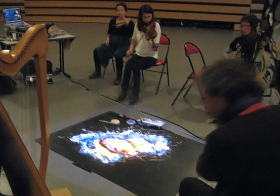 La création en temps réel d’animations à réactivité sonore vient relier l’image au son. La lumière projetée vient donner vie et animer la peinture. Cette technique Mix-Media fait une symbiose entre les arts numériques, plastiques, graphiques, sonores et la performance.