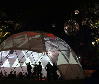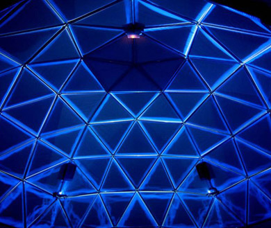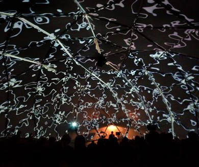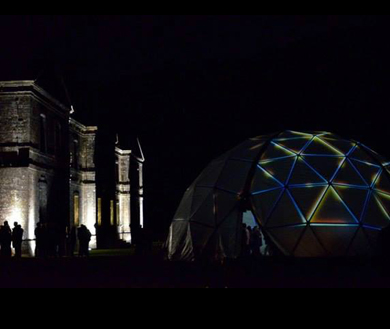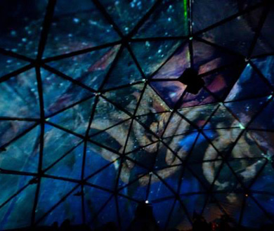 Scouap utilise le mapping de la surface complète du dôme (soit prés de 300m2 de surface) le tout synchronisé au son, comme support d’expression artistique et sémantique, ceci afin de proposer au spectateur un espace unique dans le monde du spectacle vivant.